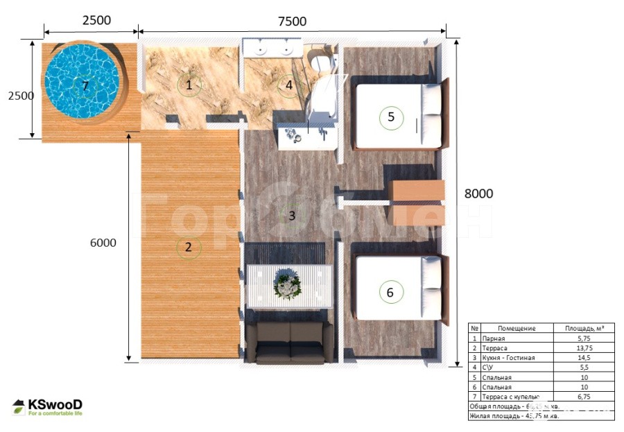 В доме две спальни (по 10 кв.м), кухня-гостиная (14, 5 кв.м), совмещенный санузел (5, 5 кв.м), парная (5, 75 кв.м) с купелью (терраса с купелью 6, 75 кв.м, купель круглогодичная, с подогревом), терраса (13, 75 кв.м). Общая площадь – 66, 25 кв.м, жилая площадь – 45, 75 кв.м. 1 этаж.